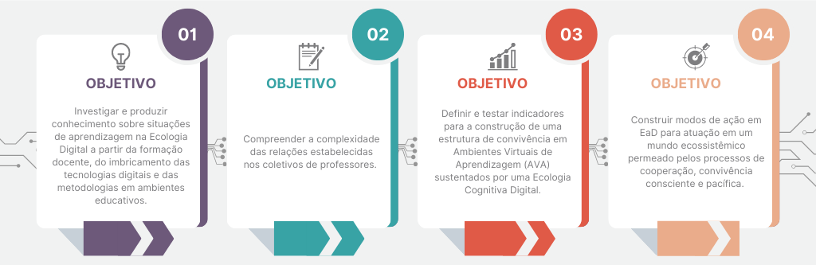 A Biologia do Conhecer (MATURANA; VARELA); a Cognição como ação incorporada (VARELA); a Epistemologia Genética (PIAGET), as tecnologias da inteligência e a inteligência coletiva (LÉVY); os saberes docentes (TARDIF) e a Ecosofia (GUATTARI) compõem a base teórica das pesquisas desenvolvidas pelo grupo. Além disso, o grupo atua nas linhas de pesquisa: Ambientes Virtuais de Aprendizagem; Educação científica: as tecnologias educativas no processo de aprendizagem; formação de professores; implantação de tecnologias para Educação; metodologias interativas e interconectivas.